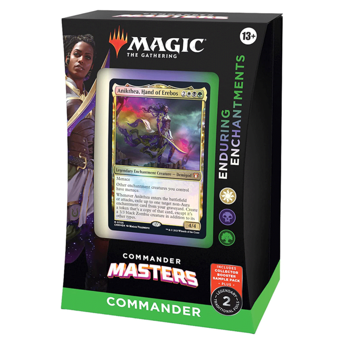 - Each deck comes with a 2-card Collector Booster Sample Pack containing 2 special treatment cards (1 Rare and 1 Rare or Mythic Rare) from the Commander Masters set