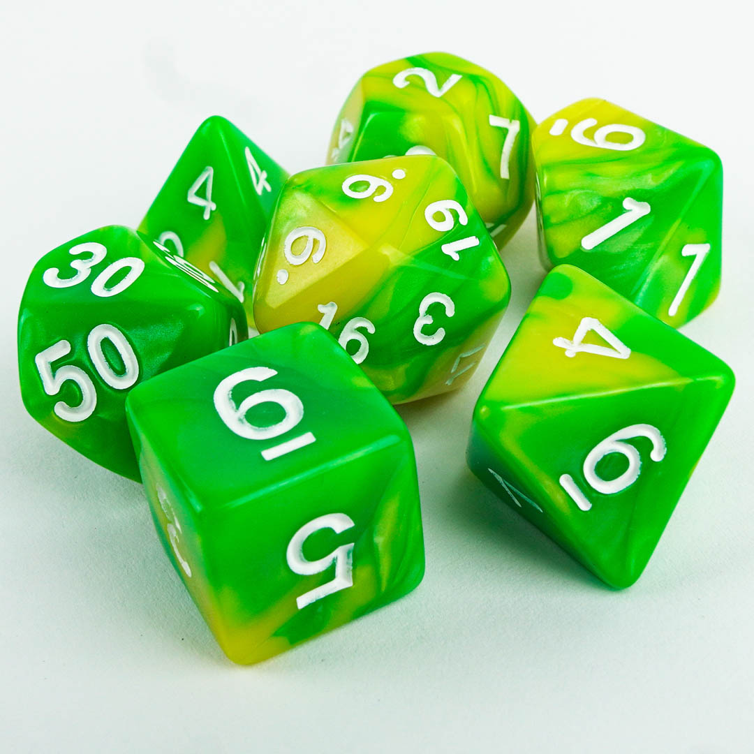 1. Raznovrsne Kocke: Set se sastoji od sedam različitih kockica (D4, D6, D8, D10, D12, D20 i D100), pokrivajući sve potrebe vaših avantura na stolu.