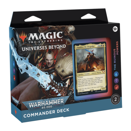 This March of the Machine Commander Deck includes 1 ready-to-play deck of 100 Magic cards (2 Traditional Foil Legendary cards, 98 nonfoil cards), 10 specialty cards, a 2-card Collector Booster Sample Pack, 1 Foil-Etched Display Commander (a thick cardstock copy of the commander card with foil etched into the card’s border and art), 10 double-sided tokens, 1 deck box (can hold 100 sleeved cards), 1 Life Wheel, 1 special die, 1 strategy insert, and 1 reference card.