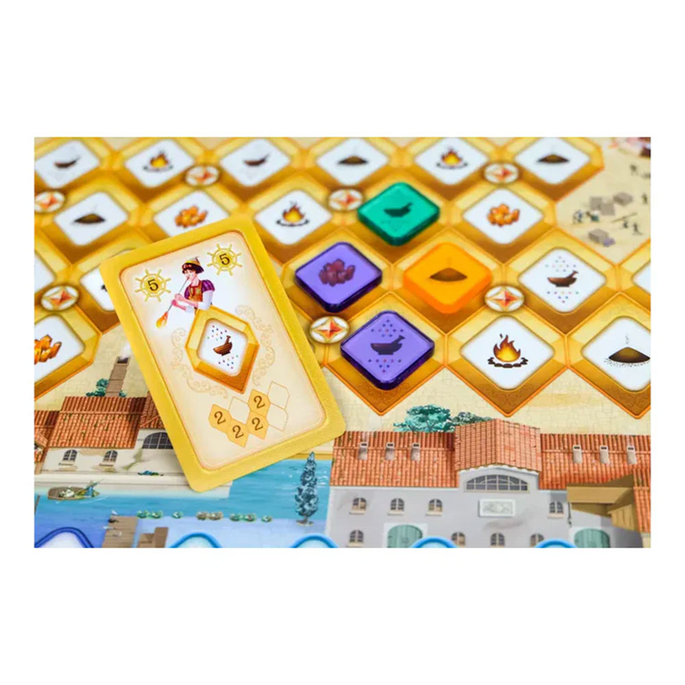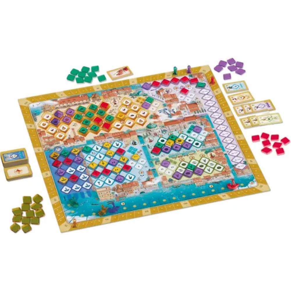 Tabla predstavlja različite faze proizvodnje i trgovine staklom – Workshops (radionice), Residences (rezidencije), Townspeople (podrška ljudi), Trade shops (trgovine) i Harbor (luka). Pametnim postavljanjem svojih diamond tokena i igranjem karata birate strategiju: povezivanje oblasti, lančano sakupljanje bodova, bonus akcije i aktiviranje moćnih kombinacija.