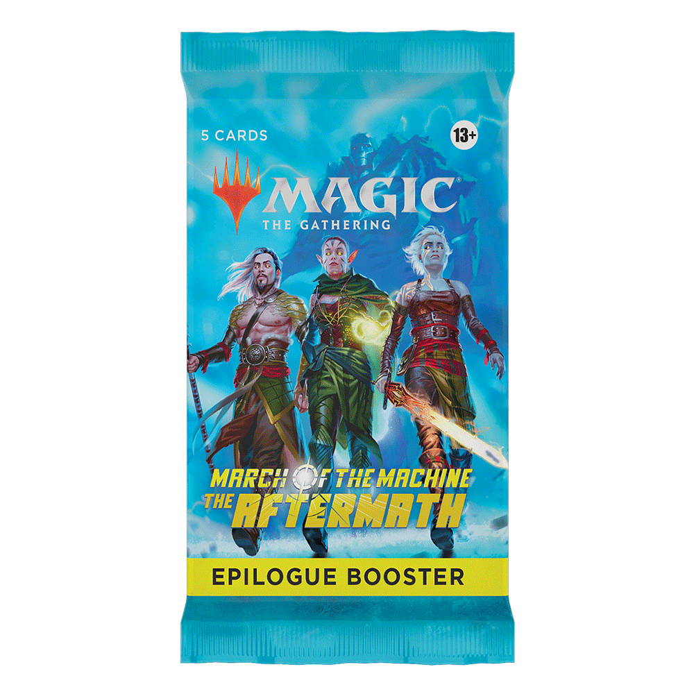 Every March of the Machine: The Aftermath Epilogue Booster contains 5 cards, with a combination of 1–3 card(s) of rarity Rare or higher and 2–4 Uncommon cards. In every pack, a total of 1–2 card(s) of any rarity are Traditional Foil.