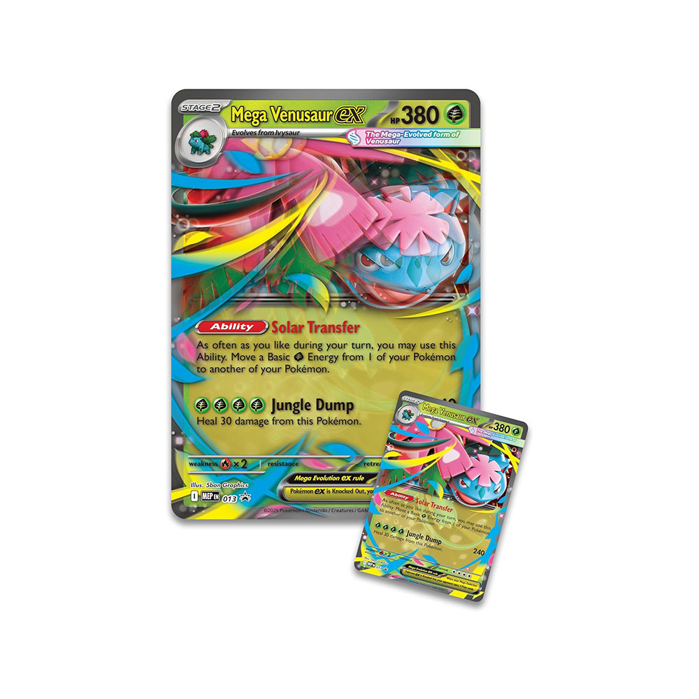 Keep your Pokémon at full flower power with help from Mega Venusaur ex! Its Solar Transfer Ability lets you move Grass Energy among your Pokémon as you please, ensuring you’re always ready to attack. In this collection, you get a playable foil promo card and an oversize lenticular promo card featuring Mega Venusaur ex, along with a tech sticker for decorating devices, binders, and notebooks. You’ll find even more Pokémon inside a stack of Pokémon TCG booster packs.