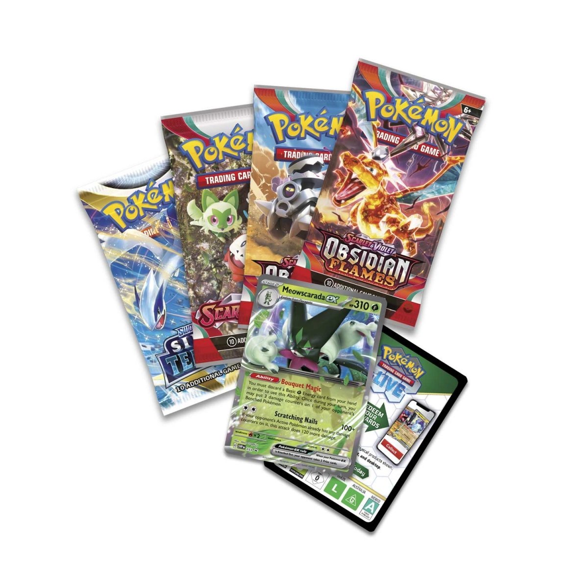 Command a rousing performance on the battlefield with a fully evolved first partner Pokémon ex! Choose the sneaky magic of Meowscarada ex in this Pokémon TCG: Paldea Partners Tin. Then, find even more Pokémon for your team inside the included booster packs!