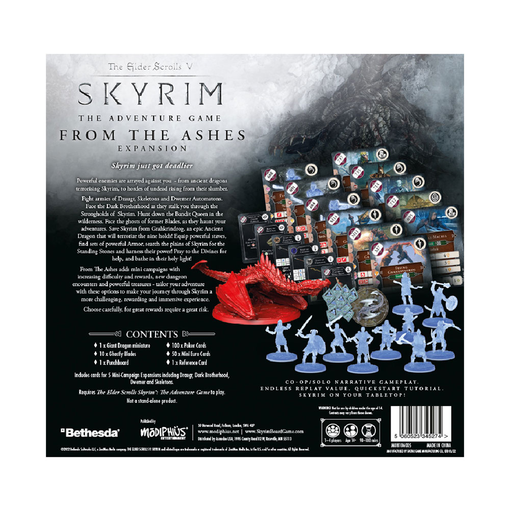 The Elder Scrolls V: Skyrim – The Adventure Game: From the Ashes Expansion donosi još opasniji i epskiji sadržaj za tvoju avanturu kroz Skyrim. Suočićeš se sa moćnim neprijateljima – od drevnih zmajeva koji terorišu zemlju, do hordi nemrtvih koje se bude iz sna. Bori se protiv Draugr-a, skeleta i Dwemer automata, dok te Dark Brotherhood prati kroz utvrđenja Skyrim-a. Lov na Bandit Queen vodi te u divljinu, a čak će i duhovi bivših Blades progoniti tvoje putovanje.