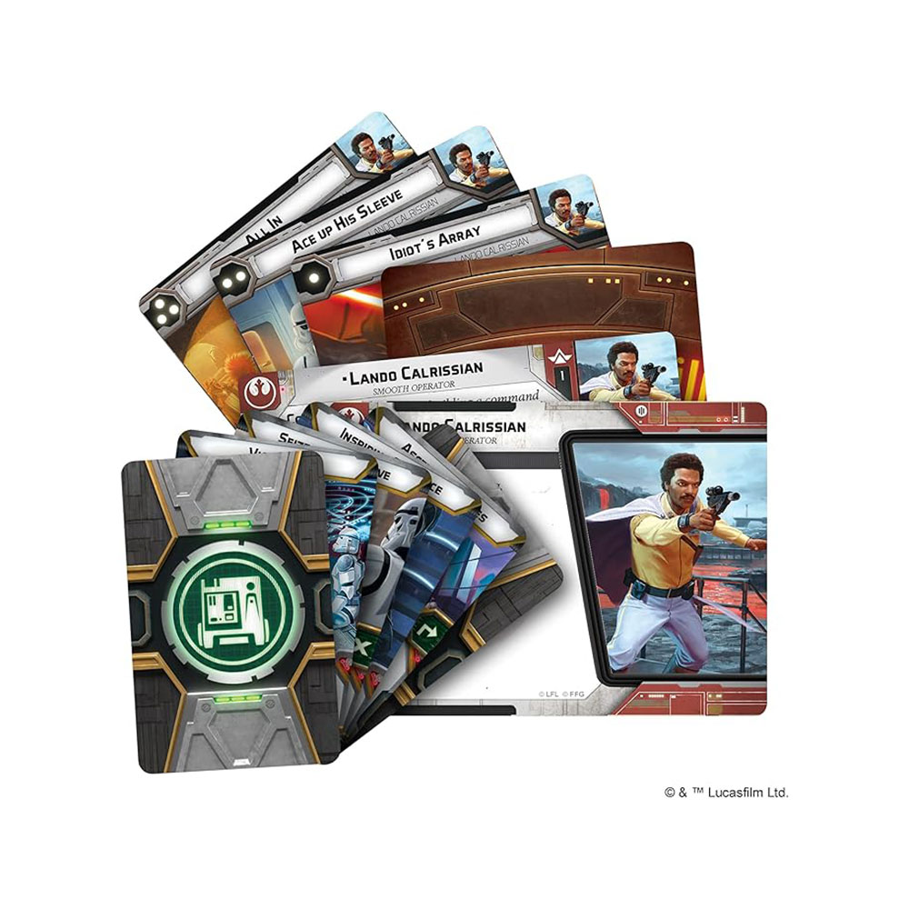 Dok minijatura daje Calrissianu jedinstvenu prisutnost na bojnom polju, ostali elementi, poput njegove unit card i tri karakteristične command cards, prikazuju njegovu prošlost kao kockara i sklonost ka preuzimanju visokih rizika. Na kraju, Lando Calrissian nije neko ko ulazi u borbu nespreman — ova ekspanzija uključuje i šest upgrade cards koje mu omogućavaju pristup opremi i obuci potrebnoj da se suoči sa svakim izazovom.