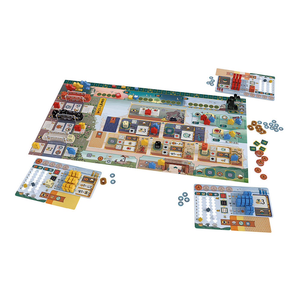Centralna tabla prikazuje Himeji Castle u svoj njegovoj raskoši, podeljen na više zona. Najveća se nalazi unutar zamka, u Sobi od hiljadu tepiha (Room of the Thousand Carpets), gde dvorski savetnici napreduju društveno, pokušavajući da se približe Daimiou i zadobiju njegovu naklonost. Tu su i ribnjak i vrtovi, koje pažljivo održavaju baštovani, nudeći mir i lepotu svima koji ih posete. Drugo važno područje su zidine i spoljašnjost zamka, gde ratnici patroliraju i stoje na straži. Konačno, tu je i oblast tri mosta (Three Bridges), gde se skupljaju tri tipa kockica koje se koriste za akcije, kao i lični domen svakog igrača, gde se prati stanje resursa i čuvaju radnici u rezervi.