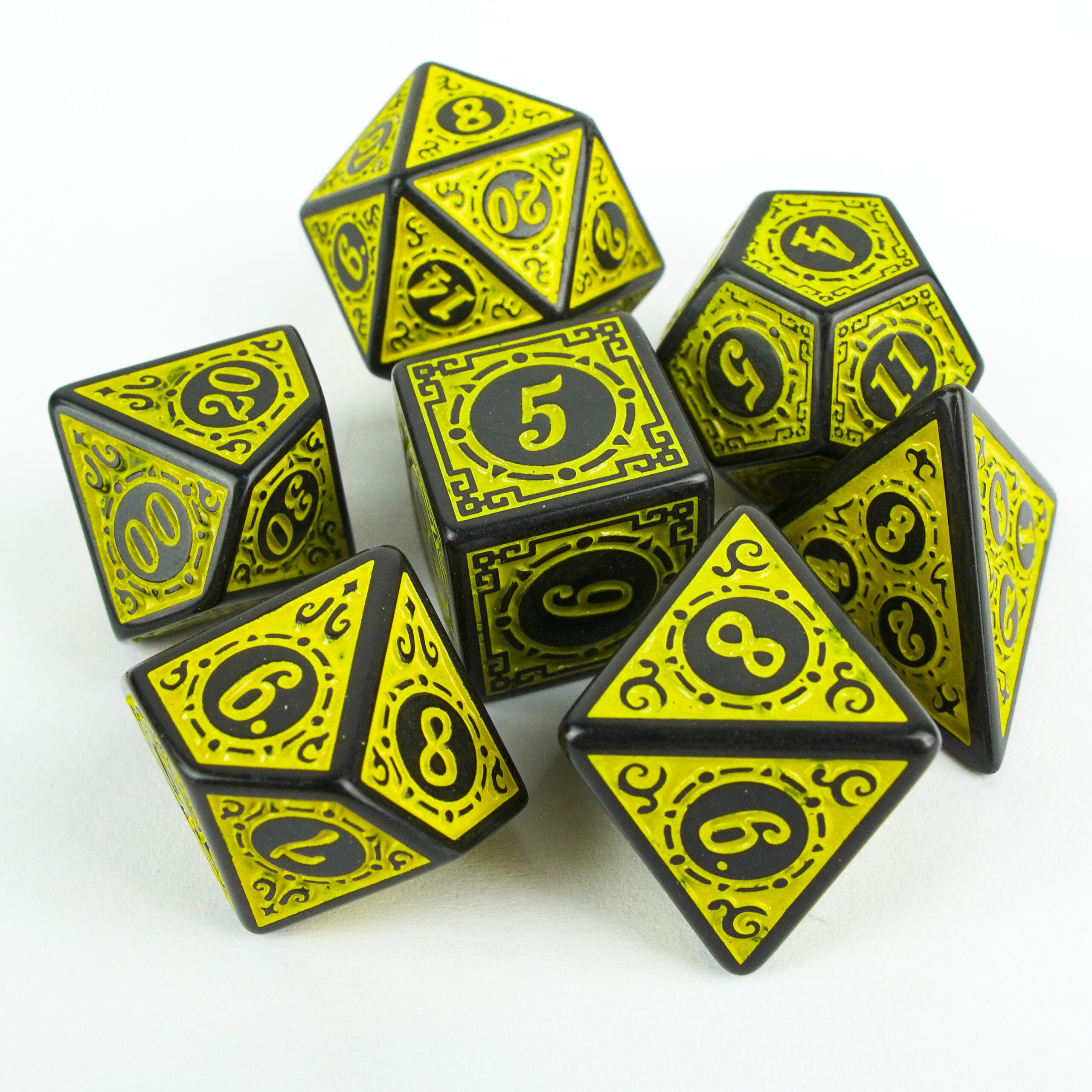 1. Raznovrsne Kocke: Set se sastoji od sedam različitih kockica (D4, D6, D8, D10, D12, D20 i D100), pokrivajući sve potrebe vaših avantura na stolu.